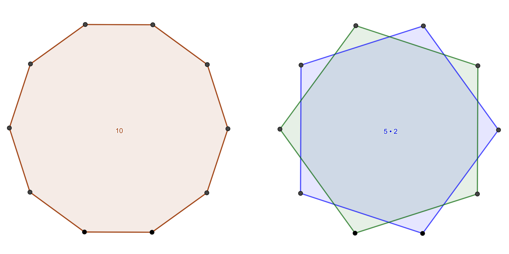Look back to the table of U_{n - 1}(z / 2) (Table 1). When I brought up U_{10 - 1}(z / 2) and decagons, I pointed out their relationship to pentagons as an explanation for why U_{5 -\ 1}(z / 2) appears as a factor. Conveniently, U_{2 -\ 1}(z / 2) = z is also a factor, and 2 is likewise a factor of 10.