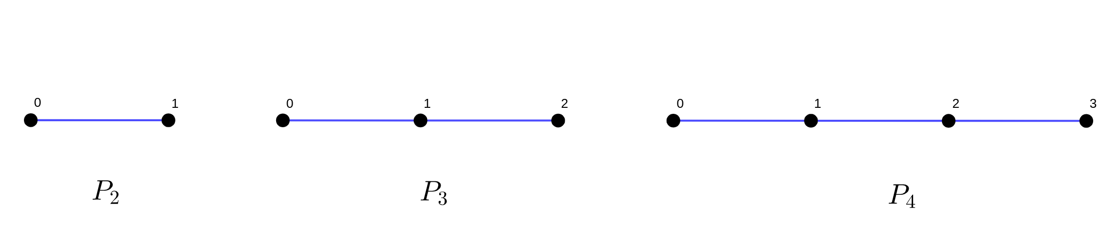 \begin{align*} P_2 &:= \begin{matrix}[ (0, 1) ]\end{matrix} \cong \begin{pmatrix} 0 & 1 \\ 1 & 0 \end{pmatrix} \\ P_3 &:= \begin{matrix}[ (0, 1), \\ (1, 2) ]\end{matrix} \cong \begin{pmatrix} 0 & 1 & 0 \\ 1 & 0 & 1 \\ 0 & 1 & 0 \end{pmatrix} \\ P_4 &:= \begin{matrix}[ (0, 1), \\ (1, 2), \\ (2, 3) ]\end{matrix} \cong \begin{pmatrix} 0 & 1 & 0 & 0 \\ 1 & 0 & 1 & 0 \\ 0 & 1 & 0 & 1 \\ 0 & 0 & 1 & 0 \end{pmatrix} \end{align*}