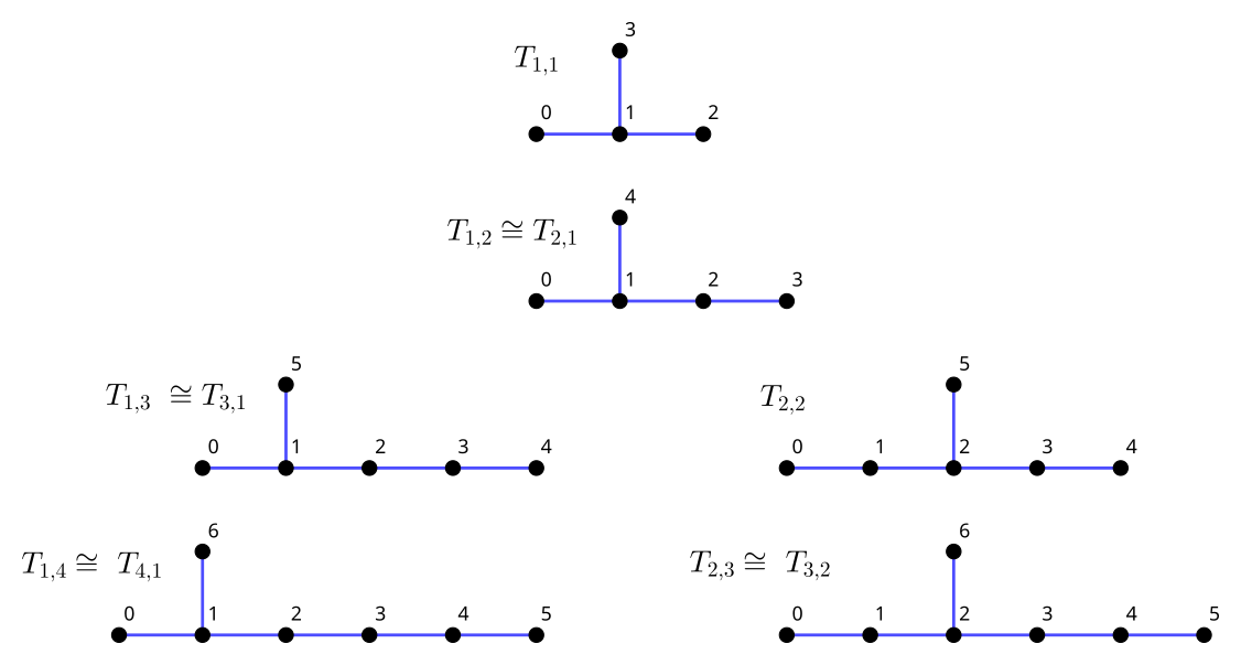 In this notation, the subscripts denote the consituent paths if the “added” node and the one it is connected to are both removed. It’s easy to see that T_{a,b} \cong T_{a,b}, since this just swaps the arms. Also, T_{a, 0} \cong T_{0, a} \cong P_{a + 2}.