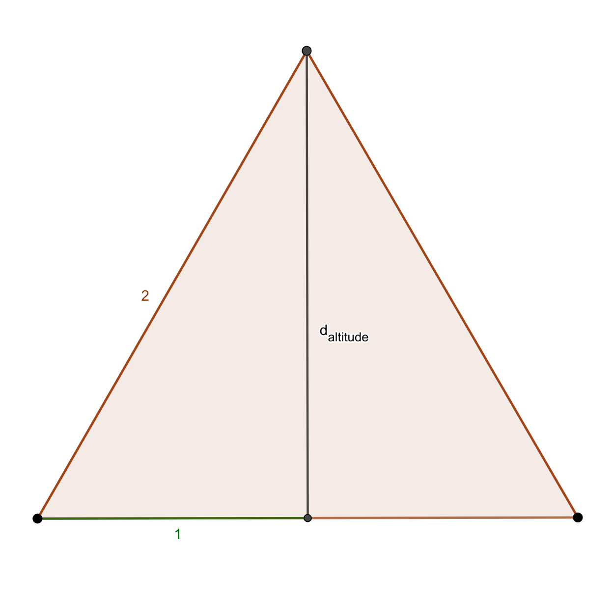\begin{align*} d_\text{altitude}^2 &= \textcolor{orange}{2}^2 -\ \textcolor{green}{1}^2 = 3 \\ B^2 &= \left ( {2 \cdot d_\text{altitude} \over 2} \right )^2 = 3 \end{align*}