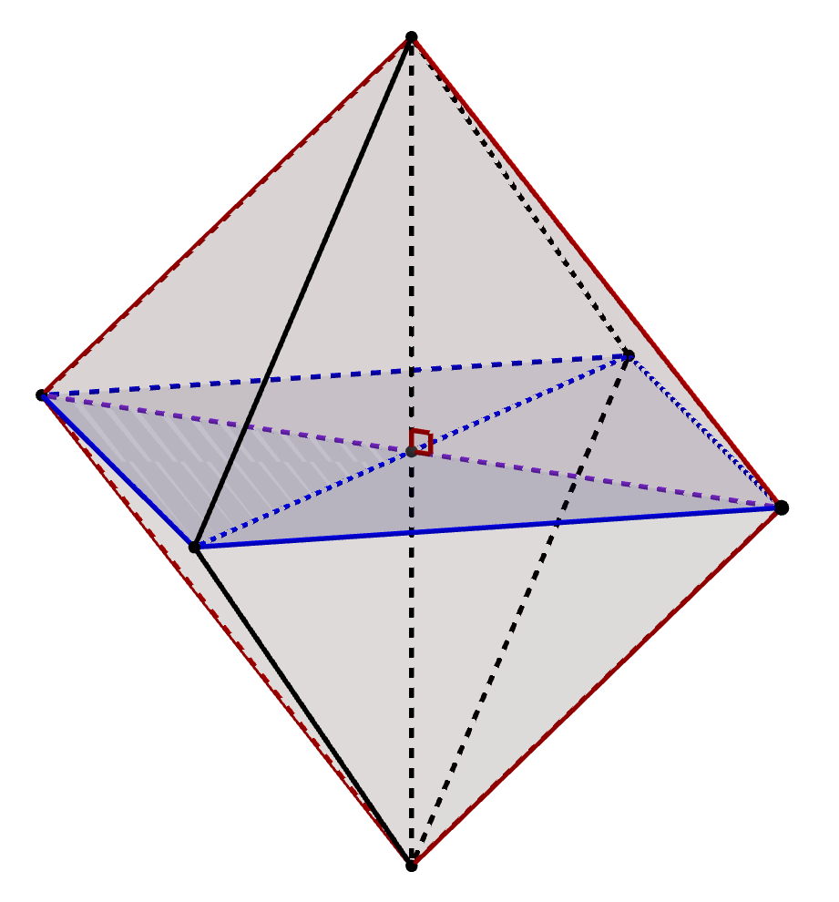 The octahedron can be thought of as two square pyramids joined end-on-end, with uniform edge length throughout. Since the base of the pyramid is a square, its center is equidistant from the vertices of the base. Due to the symmetry of the octahedron, this center is the same no matter which square we pick. Thus, the altitude h of the square pyramid is simply half of the diagonal of the square.