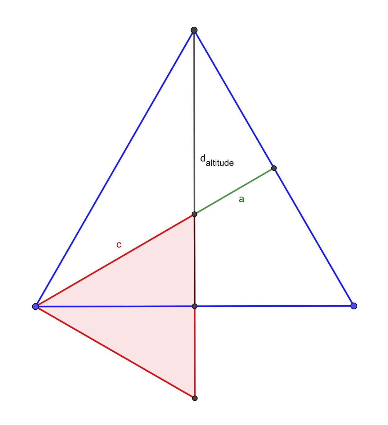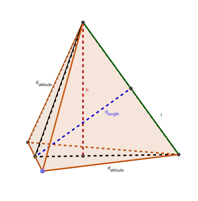 This post will calculate this ratio without using any trigonometric functions (sine, cosine, tangent), instead opting for a more compass-and-straightedge approach. Consequently, it becomes more natural to calculate the square of the volume to better cooperate with the Pythagorean theorem.