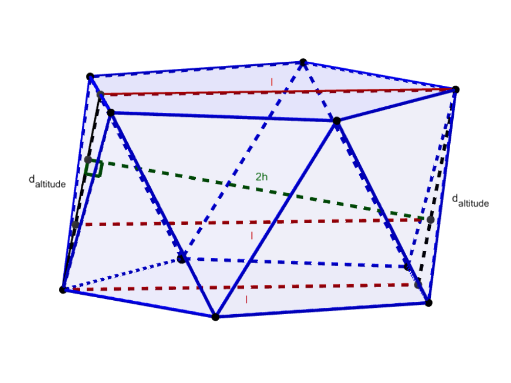 A segment connecting the centers of two antipodal faces is a diameter of the insphere (2h). This diameter can be translated along the parallelogram by a, the apothem of an equilateral trangle. This forms a right triangle with a and 2h as legs and l as the hypotenuse.