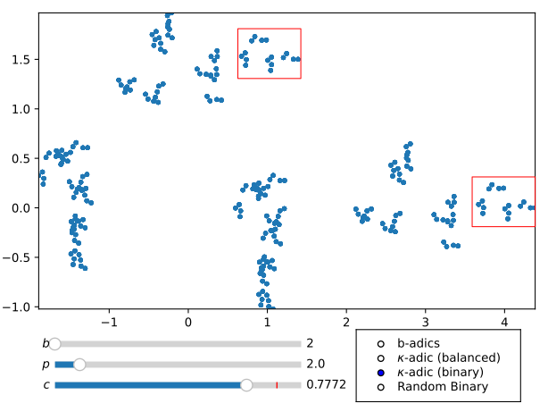 First, notice that with b = 2 and p = 2, switching between the “b-adic” option and the “κ-adic” option appears cause some points to appear and disappear. It is easiest to see this when c \approx 0.5. This corresponds with the intuition that these are subsets of the 2- and 3-adics.