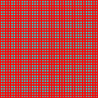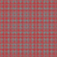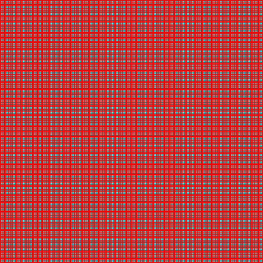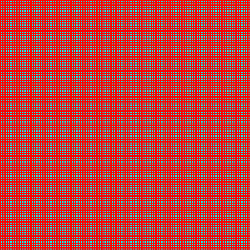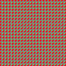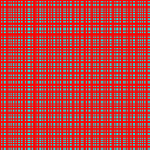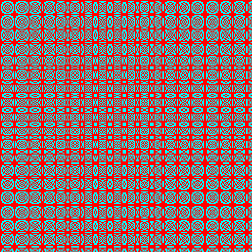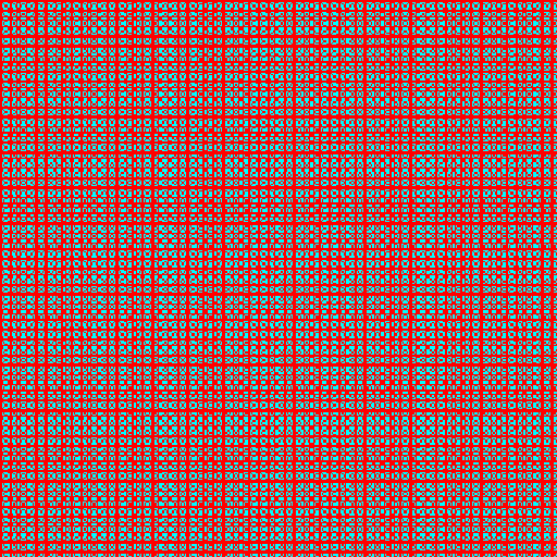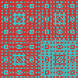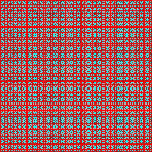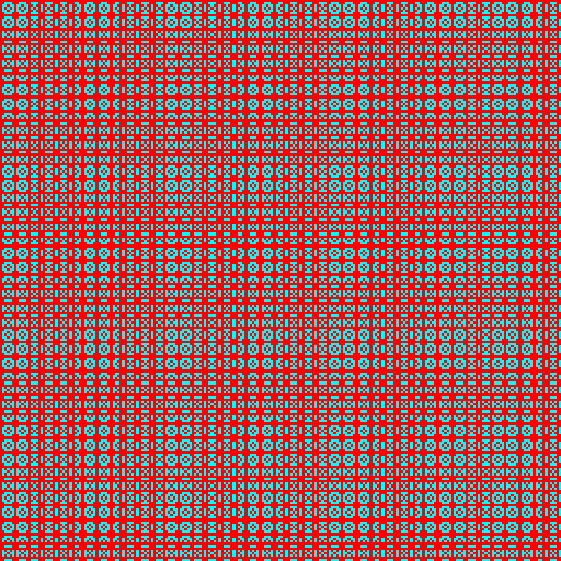 In this mapping, for n = 2, zero goes to red and one goes to cyan. The following is a 100x100 image of the multiplication table of \oplus_\text{Zeck} from zero to ninety-nine.